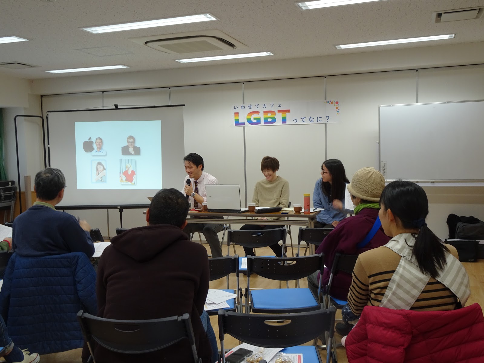まず私からLGBTとは何か?ということで、日本における状況を簡単に説明しました。最近、10年振りに改訂された広辞苑でLGBTが加わったものの、なんとその意味にTを示す性自認のことは触れられていなかったことや、昨年ゲイを笑いものにしたテレビのお笑い番組が話題になったことなどについて触れながら、まだまだ社会の中でLGBTへの認識が不足しているだけでなく、地域でも学校での取り組みなどが遅れていることについて指摘をしました。