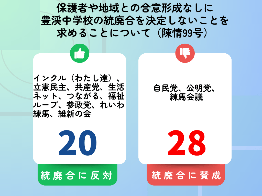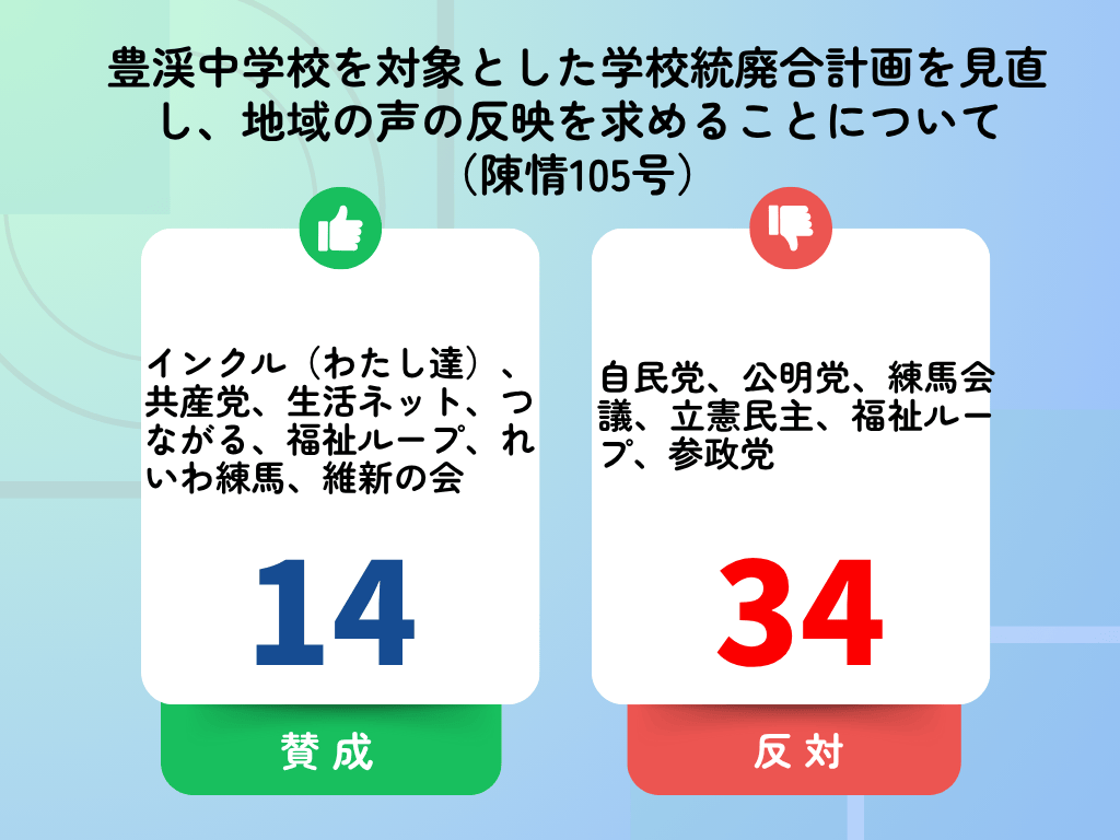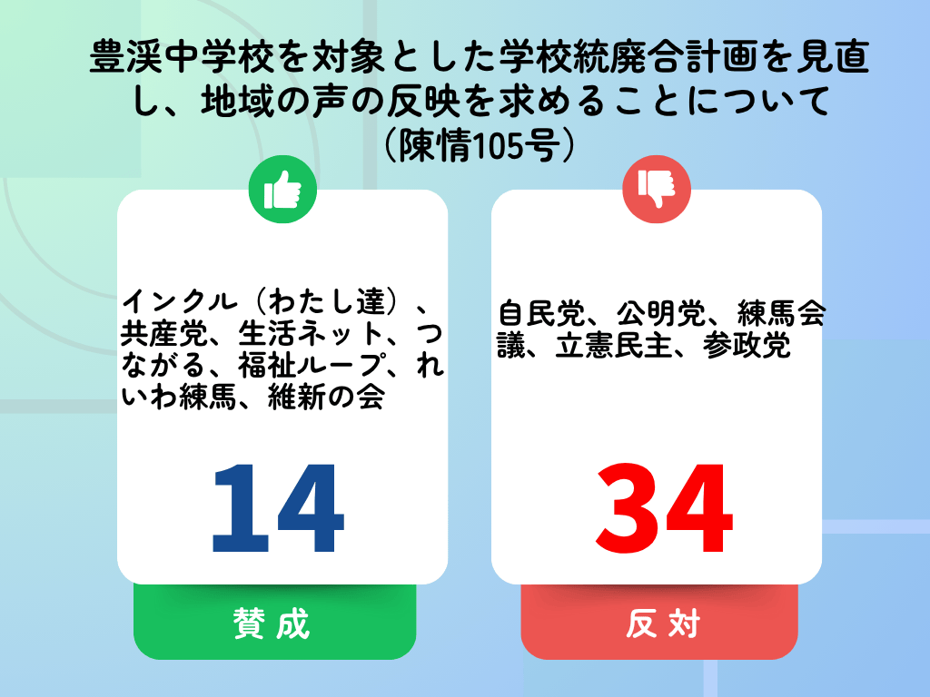 10月10日、令和7年練馬区議会第三回定例会の最終日に豊渓中学校の統廃合の反対に関する陳情第99号、104号、105号の3件の陳情を審査しました。議決の結果、いずれも不採択となりました。