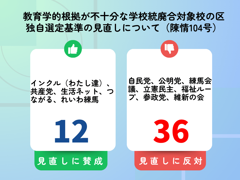 陳情第104号:教育学的根拠が不十分な学校統廃合対象校の区独自選定基準の見直しについて