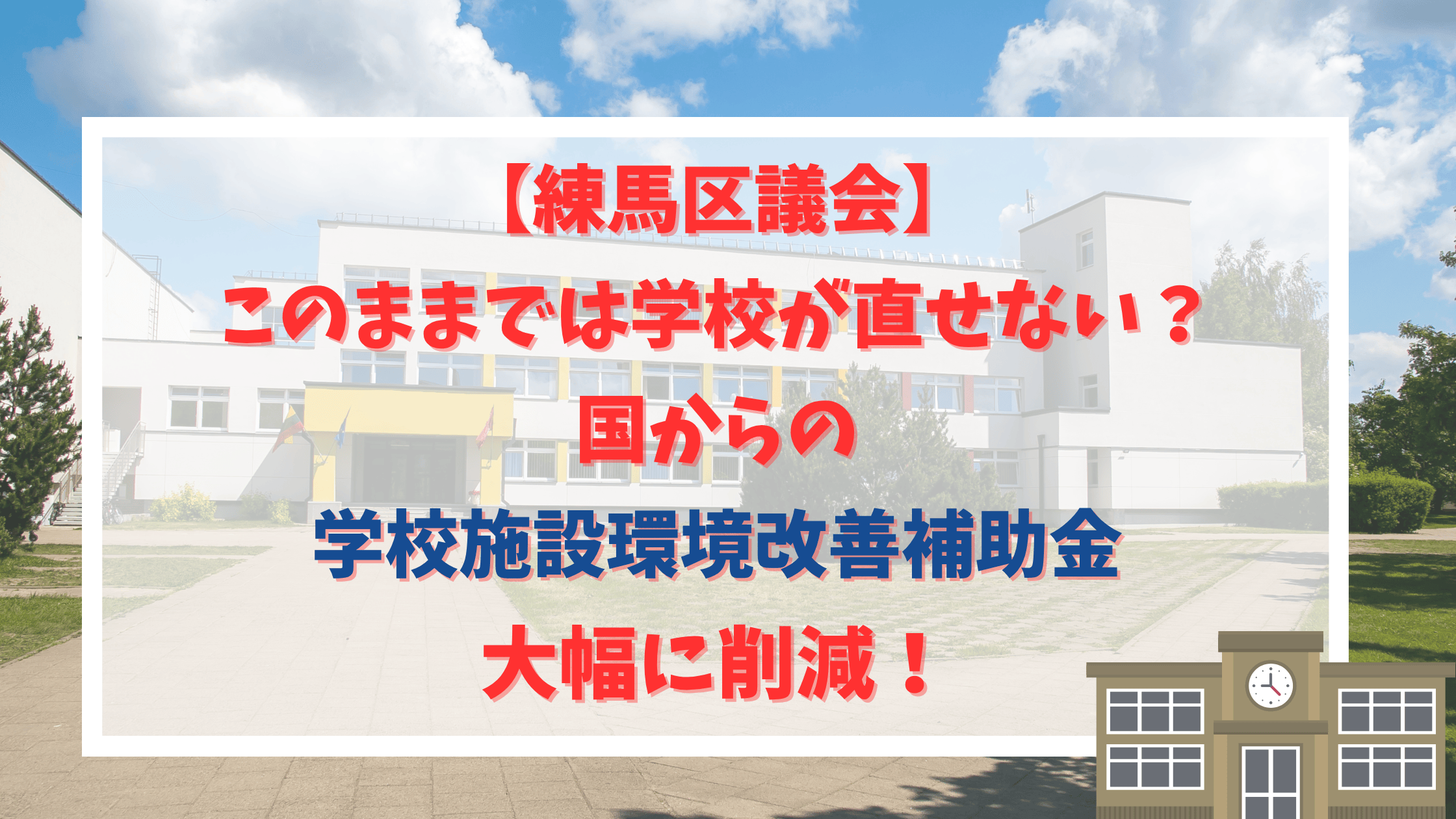 子どもたちの学ぶ環境を守るために欠かせないのが、学校施設の改修や整備です。ところが今、全国の自治体で「学校施設環境改善交付金」という国の補助金が大幅に減り、学校改修に支障が出る事態が広がっています。練馬区でも採択率がかつての100%からわずか30%へと急落。老朽化が進む学校の整備に深刻な影響が懸念されます。10月の決算特別委員会において練馬区の状況を確認するとともに対応を求めました。当日の質疑の概要をご報告します。