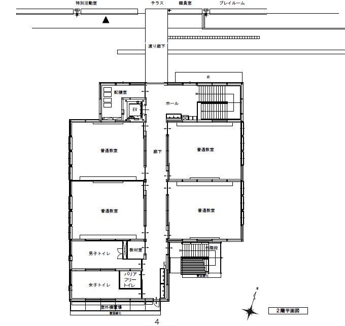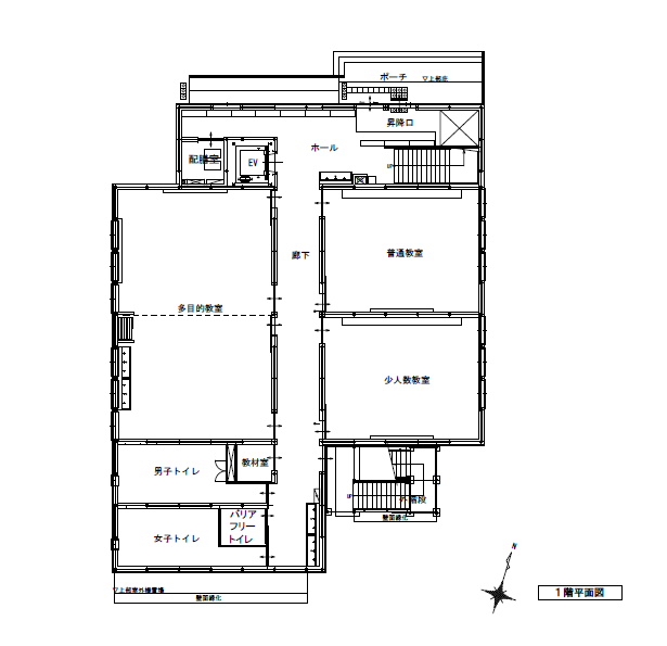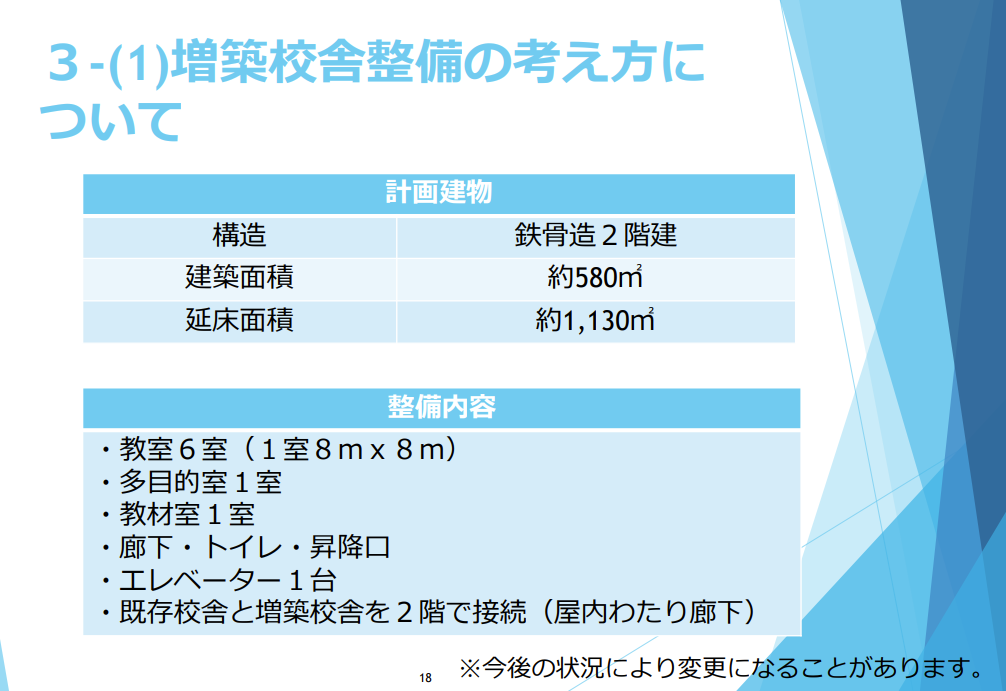 12月の説明会では延床面積 約1,130㎡と説明されていましたが運動場への影響を勘案して縮小し、今回は延床面積は960㎡、約15%ほど縮小されています。その結果、教室などに変更はありませんが、当初計画されていた2本の廊下のうち、1本がなくなったとのこと。