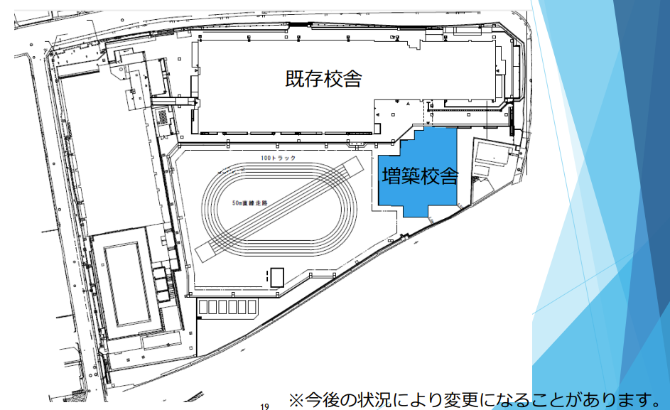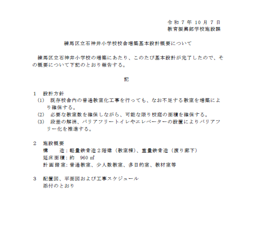 2020年に建てられたばかりの石神井小学校の増築計画について、新たな図面が10月7日の文教児童青少年委員会で報告されました。(これまでの経緯はこちらをご覧ください。)同校は区内で運動場が二番目に狭く、増築によってさらに狭くなることなどが懸念されていました。今回の案では、運動場がこれ以上狭くならないよう建物の面積を15%削ったことが報告、あわせて学校の近くに800㎡の土地を学校拡張用地として購入したことが報告されました。