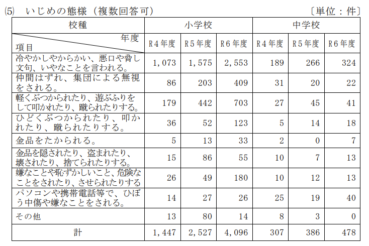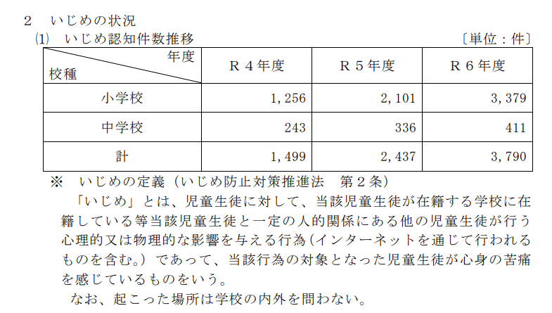 11月20日の文教児童青少年委員会において、「令和6年度 練馬区立小中学校における暴力行為・いじめ・不登校の状況について」の報告がありました。前回の記事では暴力行為の多さを取り上げましたが同じ報告の中で、いじめの状況についても極めて深刻な実態が示されています。
