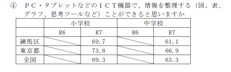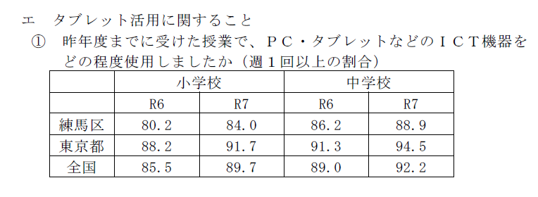 最新の全国学力・学習状況調査によると、練馬区の「週1回以上タブレットを活用している」児童生徒の割合は都・全国平均を下回る水準に留まっています。
