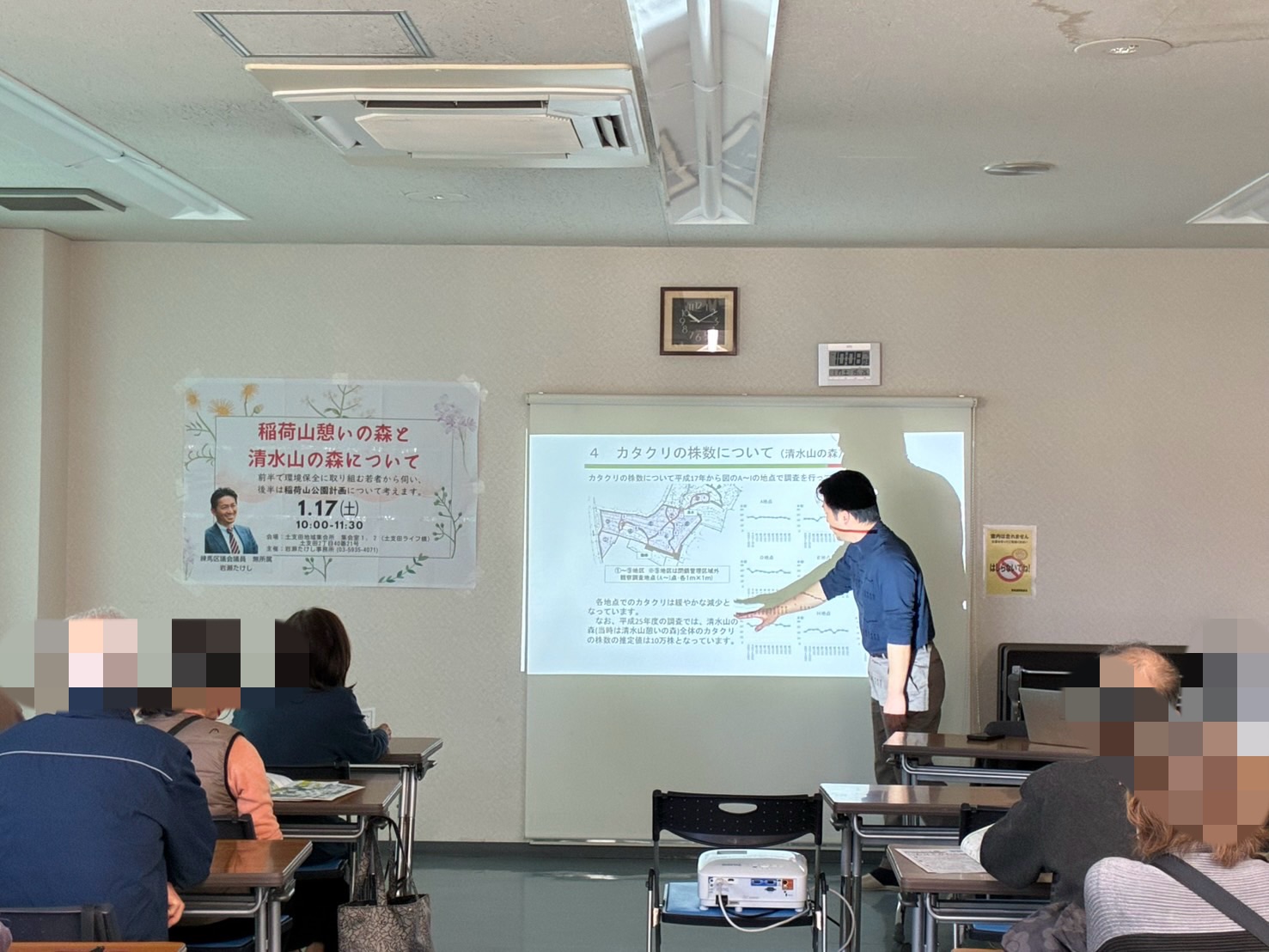 大泉、土支田に広がる清水山の森・稲荷山憩いの森をテーマに勉強会を開催しました。午前中にもかかわらず25名が参加してくださいました。ありがとうございました。この地域には、23区で唯一のカタクリの群生地があり、清水山の森には「東京の名湧水57選」に選ばれた湧水も流れています。練馬区はこの一帯を中心に、約10ヘクタールの総合公園を整備する計画です。しかし計画では、400世帯を超える住居の立ち退きや、500億円以上の事業費が必要とも指摘されています。