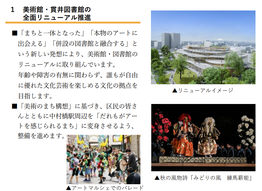 私は、いったん計画を白紙に戻し、建て替えではなく現美術館や図書館の改修に、できるだけ早く着手すべきだと考えます。貫井図書館でも照明のLED化もされず、EV故障など設備老朽化が具体的課題として挙げられています。区も「個別に必要なものは早急に実施」を検討していますが、安全・省エネ・バリアフリーの“改修”を直ちに実行すべきです。