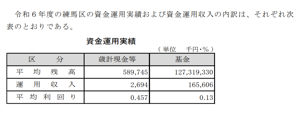 他方で、練馬区の決算資料では、令和6年度の資金運用について、平均利回りは0.13%と報告されています。