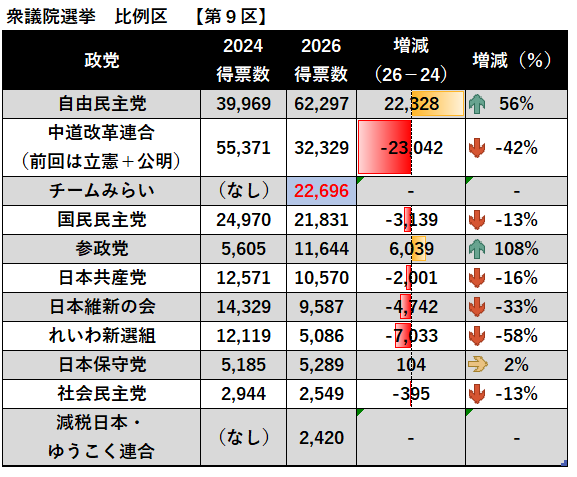 一方で、今回の選挙で立憲民主党と公明党が一緒になった中道改革連合は、得票が4割以上減少し、3万2千票に。そのほか、山本太郎氏が病気で代表を退いたれいわ新選組も6割減、日本維新の会も3割減となっています。反対に、前回は存在しなかったチームみらいが急速に支持を広げ、9区では第3位を獲得しました。また、参政党も2年前に比べて倍増しています。