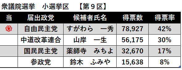 東京9区(大泉・石神井・関など、練馬区の西側を中心とする地域)では、個人名を書く小選挙区で自民党のすがわら一秀氏が約7万9千票(得票率42%)を獲得しました。