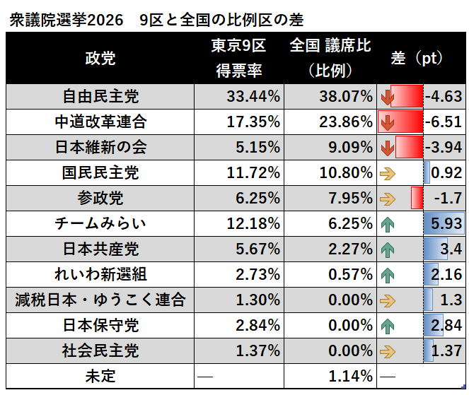 9区での比例区の得票率を、全国の比例代表での獲得議席数(勢い)と比べると、自民党・中道改革連合・維新の会・参政党は全国に比べて低い一方で、チームみらい、共産党、日本保守党、れいわ新選組は9区で人気が高いことがわかります。