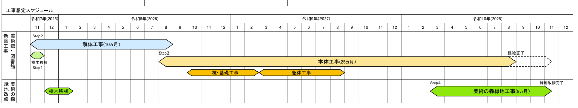 2.その後の2024年8月に行われた住民説明会では工期が約3年(美術の森緑地などを入れると4年近く)に伸びたことが示されました。