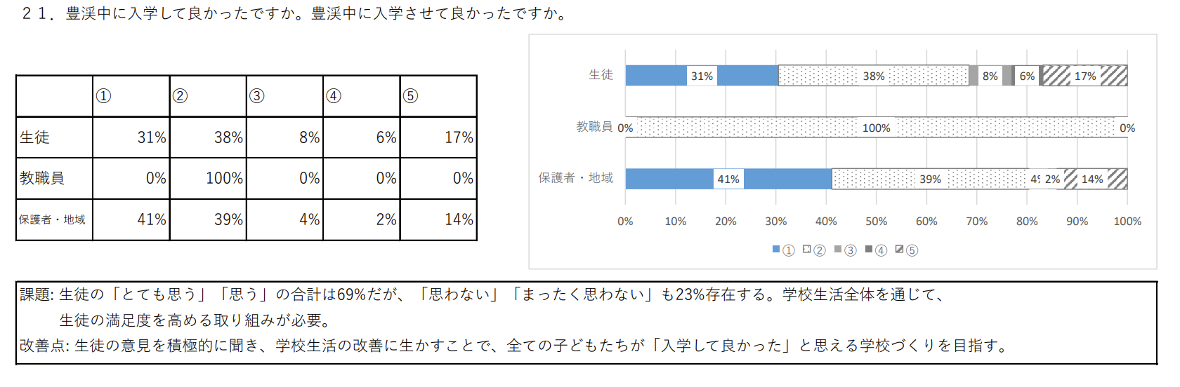 これに対する区の答弁は、「一概に比較できない」「断定できない」といった回答でした。しかし、学校自身も数値が低いことについて、学校生活全体を通じて、生徒の満足度を高める取り組みが必要であるとしています。