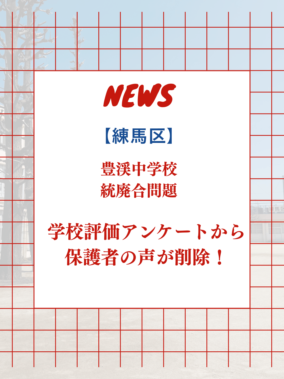 練馬区は多くの反対の声を無視し、令和11年には豊渓中学校を閉校しようとしています。その中で、これまでは新入生の指定校変更は「統合の2年前」からだったにもかかわらず、今回は特例として3年前、令和8年度入学(この4月)から認めました。区はこれまでのやり方を変えてまで、統廃合を進めようとしているのです。