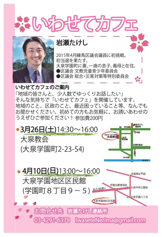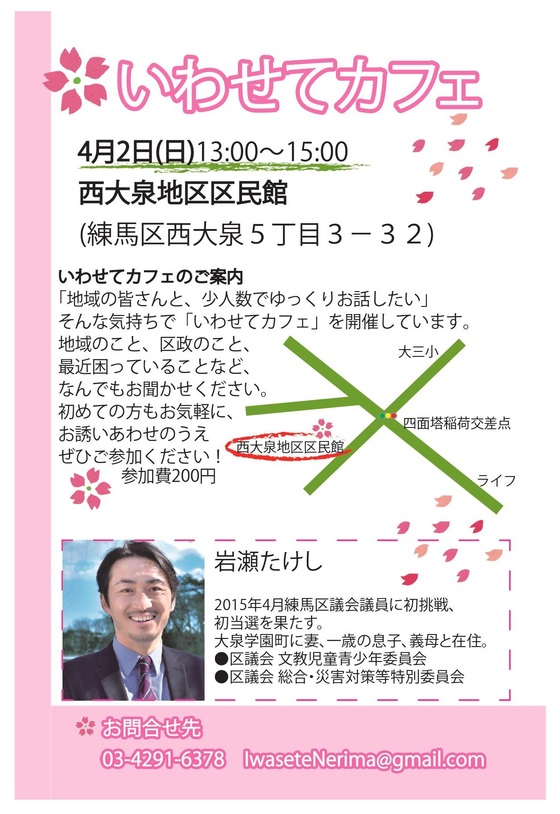 いよいよ明日から「いわせてカフェ」を行います。このいわせてカフェ、地域の皆さんとお茶を飲みながら、少人数でゆっくりと区政のことや地域のことについてざっくばらんにお話したい、そんな思いで開始してもう10回を数えようとしています。今回は通常の区政報告に加えて、皆さんからもたくさんのお話を聞かせていただけたらと思っています。明日は14時半~大泉教会で行います。
