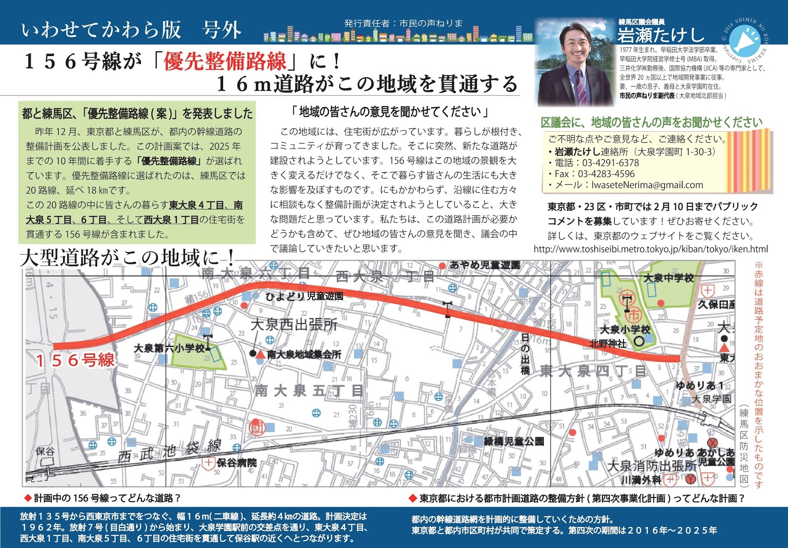 その中の一つで、かわら版をお配りする地域にもあたる156号線は、1962年に建設が計画されたもので、目白通りから始まり、大泉学園駅前の交差点を通り、東大泉4丁目、西大泉1丁目、南大泉5丁目、6丁目の住宅街を貫通して保谷駅近くへとつながるものです。