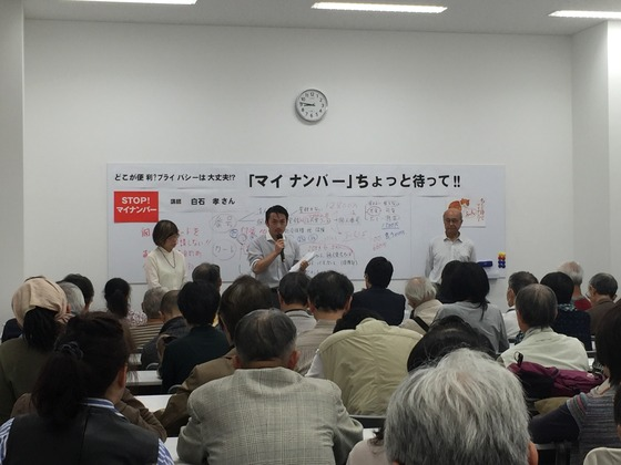 昨日、市民の声ねりま主催でマイナンバー勉強会を行いました。講師には「共通番号いらないネット」世話人の白石孝さんにお越しいただきした。会場には80名分の席を用意したのですがあっという間に満席に。マイナンバーが間もなく本格施行される中での皆さんの高い関心を実感しました。