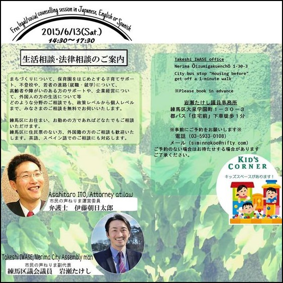 市民の声ねりま運営委員・弁護士 伊藤朝日太郎 の2名が、みなさまのご相談を無料でお伺いいたします。