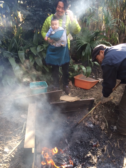 朝の10時前から気合いを入れたお父さんたちが集まって、薪に火をくべる。そしてある程度火が強くなったころに子ども達が登場。お父さんの雄姿に歓声を挙げながら、恐る恐る火や煙に近づく。