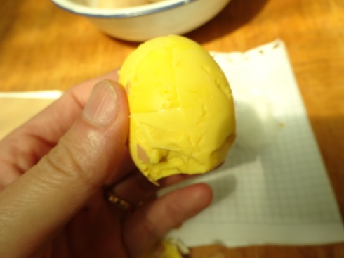 なんと、殻をむくと白身のない黄身だけの卵が登場!こんな卵を見たのは生まれて初めて、慌てて周囲の方に見せてもこんな卵をみたことはないとのこと。いつの間にか人が集まってきて、もしかして白身と黄身が逆なんじゃない(?)とか訳の分からないことを話したりしたのですが、割ってみても全部黄身。