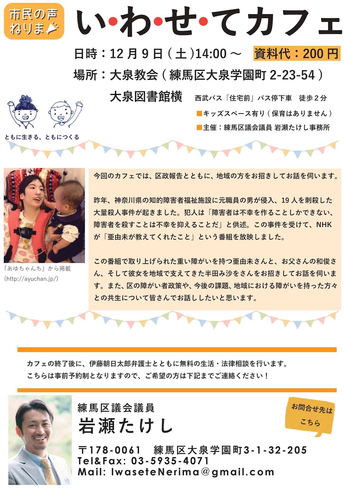 次回は12月9日、地元の大泉教会で、区政報告とともに地域の方をお招きしてカフェを行います。今回のカフェでは、津久井やまゆり園での事件に関連して地域における障がいを持った方との共生についてお話します。去年、神奈川県の知的障害者福祉施設に、元職員の男が侵入、19人を刺殺した大量殺人事件です。犯人は「障害者は不幸を作ることしかできない、障害者を殺すことは不幸を抑えることだ」と供述しました。この事件を受けてNHKが今年「亜由未が教えてくれたこと」という番組を放映しました。今回のカフェでは、この番組に登場した亜由未さんとお母さんの智恵さん、そして地域で支えてきた半田みさをさんをお招きしてお話を伺います。ぜひご参加ください!