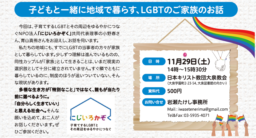 子育でするLGBTとその周辺をゆるやかにつなぐNPO法人『にじいろかぞく』共同代表理事の小野春さん、青山真侑さんをお迎えし、お話を伺います。
